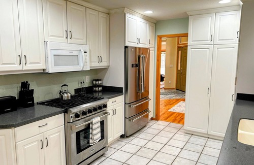 Upstairs, you'll find a thoughtful layout perfect for groups or families: one bedroom features a bunkbed with a full and twin-sized bed, another holds a cozy queen, and two additional bedrooms each include queen beds with views overlooking the lush redwood yard.