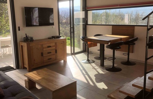 - 70 m2, cathedral living room, South and East exposure, large terrace with bioclimatic pergola, barbecue, private garden and parking.