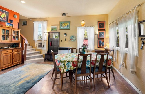 This cozy artsy home is unique with the owner's and owner's friends art through out. Take it easy and relax at this tranquil getaway, indoors and outdoors. This cozy artsy home is a warm and inviting place to stay. "A place to want to be." is what my friends say! Enjoy the deep soaking tub in the downstairs bathroom. Your cozy bedrooms are up a steep narrow set of stairs. Wake up to the birds and or frogs singing in the morning. There is a rooster that crows in the distance, not ours. On occasion coyotes howl some nights, as they run the creek bed far, far below. There is 1 queen bed and 2 full/double beds. Book now and enjoy everything this lovely property has to offer!