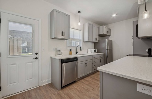 Modern Kitchen with Stainless Steel Appliances – Includes a dishwasher, microwave, fridge, and more – everything you need to cook at home.