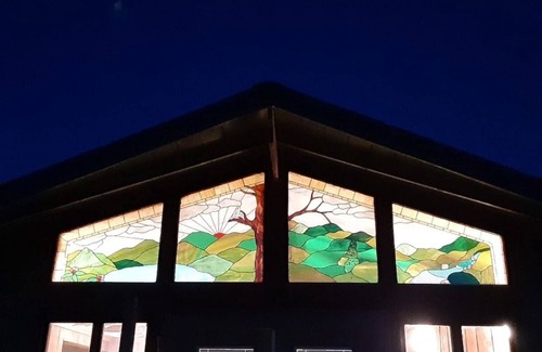 At this funky 2BR cottage just outside downtown Hendersonville, five minutes from all the fun on Main Street and only twenty from the trails at Dupont with free attraction tickets for Biltmore, axe throwing, ziplining and more make it easier than ever to head out the door. After a day out on the town, cue up a movie on the bigscreen TV and admire the stained-glass murals while dinner’s cooking out on the grill. The king bed, full bed, and pullout sofa make turning in a breeze for the whole crew.