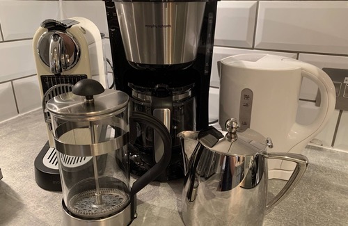 The kitchen has a breakfast bar area with seating for 2 and has everything you need to prepare meals at home. It has a fridge/freezer, electric 4-burner stove top, electric oven, dishwasher, microwave, Nespresso coffee maker, American filter coffee maker, French press, kettle, toaster, lots of pots, pans, plates, cutlery, glassware, etc. We also have a 'baking pack' available - ideal for longer-term stays and baking enthusiasts. The washer is in the kitchen and there is a vented tumble dryer upstairs.