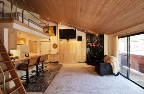 Spacious studio loft condo. Corner unit on the top floor. Vaulted ceiling. FURNITURE UPDATED. Located in downtown Aspen's central “Core” in a quiet beautiful neighborhood. Large sliding glass doors walk out to a spacious patio with a facing view of Aspen (Ajax) Mountain. Across the street is the Roaring Fork River, hiking path & bridge. 2 blocks to shopping, restaurants, nightlife, skiing, hiking & biking. Gondola is 6 blocks away, Wood Burning Fireplace, FREE Parking, Washer/Dryer, Ski Locker.