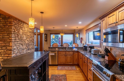 The main level features an open living and dining room and kitchen, accentuated by a floor-to-ceiling stacked-stone remote button gas log fireplace between the living room and the kitchen. The living area has two comfortable seating areas, with enough room for everyone. Relax in the large leather sectional and enjoy panoramic mountain views through the wall of windows. In fact, nearly every room in the house has a spectacular view. The high ceilings in the living room make every day a beautiful day, providing panoramic views from every window. Two comfy lounge chairs in front of the fire place make this a perfect place for a family game night.