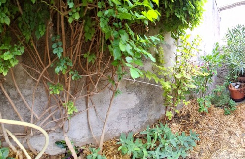 La cour a été entièrement végétalisée en permaculture. Le sol est paillé. Attention, la maison est non fumeur dedans et dehors. Cet espace demande un entretien minutieux. On intervient régulièrement. Nombreux insectes y habitent. Les chats et les oiseaux y passent souvent. La maison et la cour forment un biotope.