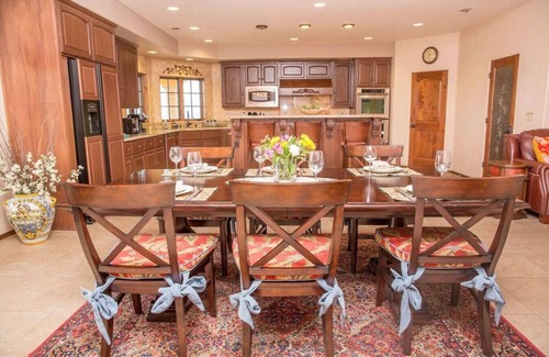 Escape into the heart of wine country on our lush thirty acre working vineyard with panoramic views of rolling vineyards and luxurious amenities and spectacular stargazing at night. Our Tuscan Style Villa and separate Guest House is furnished with many works of art from around the world and hand painted murals to complete the ambiance. Enjoy a glass of wine on the covered patio while the three fountains echo in the adjacent courtyard. Welcome home! Inquire for events of up to 90 guests.