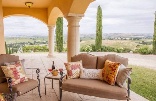 Escape into the heart of wine country on our lush thirty acre working vineyard with panoramic views of rolling vineyards and luxurious amenities and spectacular stargazing at night.. Our Tuscan Style Villa is furnished with many works of art from around the world and hand painted murals to complete the ambiance. Enjoy a glass of wine on the covered patio while the three fountains echo in the adjacent courtyard. Welcome home! Inquire for events of up to 90 guests.