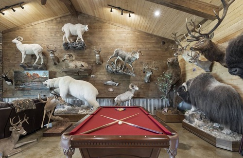 This high-end hunter's lodge is set on 300 acres of hill country ridges filled with live oak, shin oak, an pasture grass with native and exotic animals. It can host up to 24 people in this hunter's paradise retreat for the whole family.