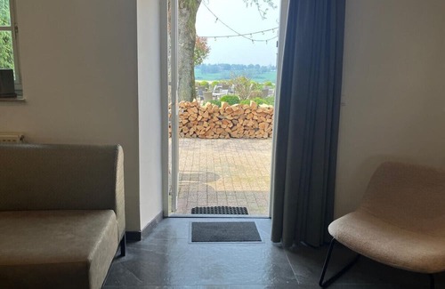 De living grenst direct aan het buitenterras met weids uitzicht over de grote weide die tot het complex behoort en op het Limburgse landschap. Daar is heerlijk genieten van een etentje en een drankje. Ben je met kinderen, dan kunnen die naar hartelust spelen in de weide en kun je ze toch in de gaten houden.