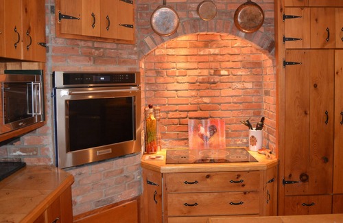 pine cupboards, sandstone counter tops, an island, wooden beams,new stainless KitchenAid wall oven built into the brick wall, Thermador cook top, and a Corian pastry counter.
