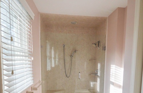 The Master Suite has a king bed, en suite bathroom with two sinks, large tiled shower with built-in bench and 2 shower heads.