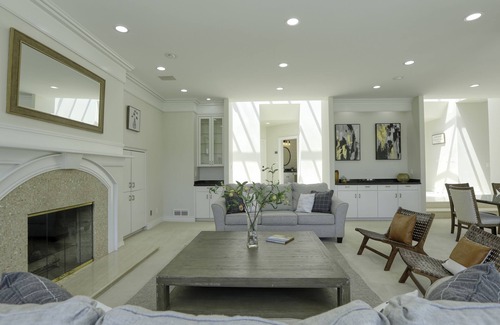 The open concept gourmet kitchen has a beautiful 14 feet waterfall island, that is custom made for culinary teaching experiences. The island can seat seven people, and the kitchen farm table seats another eight comfortably. The formal dining room invites the outdoors in with its surrounding glass windows and seats additional ten guests.