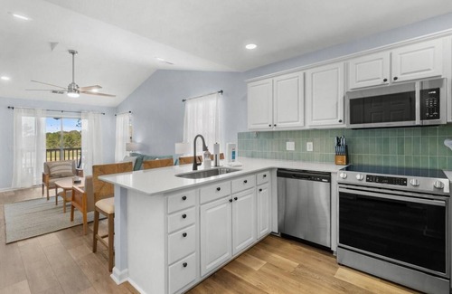 This contemporary two bedroom, 3rd floor villa 59F of True Blue Resort offers splendid accommodations in peaceful Pawleys Island. These accommodations come standard with a full kitchen, multiple TVs with cable, washer/dryer combination, and private balcony with golf course and lake view.