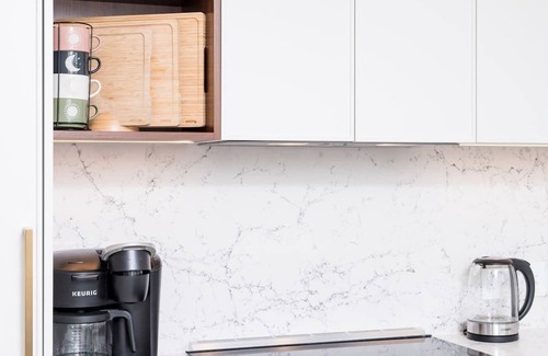 The gourmet Kitchen is fully equipped with everything you need including dishes, glasses, cutlery and pots and pans. The kitchen features Shaker-style birch cabinets and tile floors, granite counter tops and full-size Energy Star GE s stainless steel appliances (four burner stove, oven, microwave, dishwasher and side-by-side full-size refrigerator with ice maker), toaster, and coffee maker. Coffee, tea and sweeteners are provided. *disclaimer* pictures might be different than the real apartment because we have multiple units in the building and we do have varieties of furniture items. Parking is free for monthly stays*.