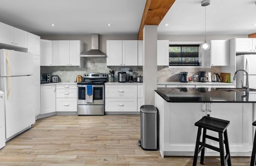 Our cottage features a spacious and modern kitchen, recently renovated in 2019, offering captivating lake views. The large dining area is perfect for family meals.