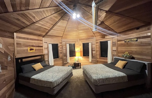 Sleeps 12,private custom 5,000 Sq Ft barn style house on 6 acres with Bluff views. 32’ ceiling in main room, cat walk, Indoor Slide! Beach room with sand floor, 8 person hot tub, swings, and bar. Sand Volleyball Court! Large deck,3rd floor loft with 75” TV, cozy entertainment space. Jetted whirlpool tub and body shower in large spa suite, Smart TVs, fully stocked kitchen, dishwasher, Game Room (Pool table, wall cornhole, darts), Karaoke! Arcade game console 2400 games. WiFi, screen porch with bluff views, grill, fire pit, four car heated garage,5 bedrooms, 3 full bathrooms 1 half bath, laundry, loft. On Snowmobile Trail! Next door to Devils Head Ski/Golf Resort, 1/2 mile to Parfrey’s Glen (waterfall/hiking), 2 miles to Lake Wisconsin, 3 miles to Devils Lake State Park, walking distance to The Old Schoolhouse Special Events Restaurant, 8 miles to Cascade Mountain Ski Resort (Kids ski free/tubing!) Kids can sled behind house!