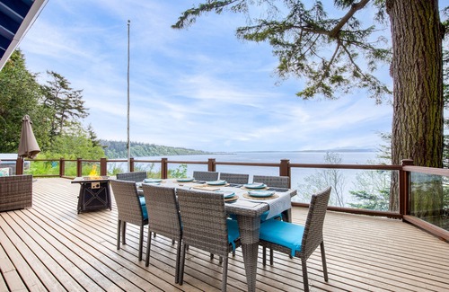 Outside, panoramic sunsets and a private stairway to the shore beckon – a 3-4 minute walk to 4+ miles of sandy walking beaches. Driftwood forts, campfires, salmon fishing, and old-growth forest hikes await. Lounge on the entertainment deck, warmed by the gas fire pit, gaze at eagles and whales, or take a soak in the hot tub as you take in the waterfront views.