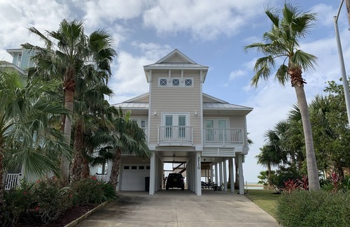 Our beautiful bayfront home is located in the Isla Del Sol subdivision and overlooks Galveston's West Bay, with fast and easy access to the beach - 1 mile. We have fabulous fishing right off our dock while only 15 driving minutes away from Schlitterbahn, Moody Gardens and all Galveston Island fun.