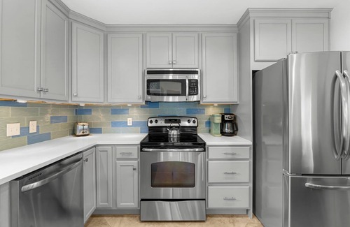 Step inside and let the gentle coastal hues and natural sunlight wrap you in warmth. The open-concept living space is bright, breezy, and beautifully appointed with stylish furnishings and a relaxed, beachy elegance. A fully equipped kitchen—complete with gleaming stainless steel appliances and generous counter space—invites you to prepare everything from morning mimosas to sunset seafood feasts.