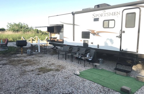 Fully stocked kitchen including paper plates/bowls, paper towels, plastic utensils, solo cups, coffee cups to go, BBQ utensils, cooking/serving utensils, assorted steak knives, pots, aluminum trays and a basic first aid kit. All cabinets are labeled for your convenience. Coffee maker, coffee (Dark Roast), filters, sugar, creamer, artificial sweetener. Condiments and basic spices. Kitchen soap, trash bags, bodywash, shampoo, conditioner, and toilet paper. All bed linens, kitchen, and bath towels. Daily towel service is available for an extra fee. Outdoor kitchen with refrigerator, cook top, Presto Fryer, cook top boiling pot, charcoal electric starter and coal/ash can. Four chairs, table, fire ring and fan, which is in the front storage compartment for your use to help keep you cooler in the summer months and to help keep the gnats and mosquitos at bay. Shared fish cleaning table on the dock directly across the street from Camp Cocahoe. Three crab nets in the front storage compartment of the camper.