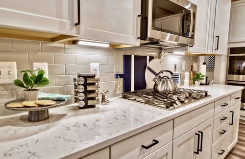 Gourmet Kitchen– State of the artstainless steelappliances including double electric ovens, built in gas cooktop, French doors refrigerator with two types of automatic ice making. (An extra refrigerator is provided in the garage.) Quartz countertops and large island with 4 counter chairs. All new dinnerware, glassware, cooking and eating utensils. Fully furnished spice rack. Keurig and French Press coffeemakers. Lots of cabinet space and a pantry.