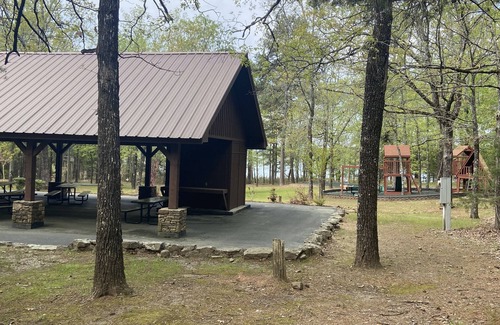 Come enjoy nature's beauty in the heart of the hills in north central Arkansas in this cozy A-framed cabin! The infamous Greers Ferry Lake is just a short walk away from this cozy cabin! You can actually SWIM at the area within a short walking distance away from this cabin... so you literally have SO much to do with the family (in nature) at this cozy cabin! "Cedar Pines" is especially perfect for families, since it is located in front of the Tannenbaum pavilion and playground area, right in the heart of Tannenbaum resort. Adults can visit and relax on the back deck, while the kids play on the playground, still in their sight! There is a room upstairs great for the kids too, with an "old school nintendo," many board games, cards, and more. Two levels make it great for adults to relax downstairs, while the kids play upstairs as well. Come check out this comfortable cute cabin TODAY!