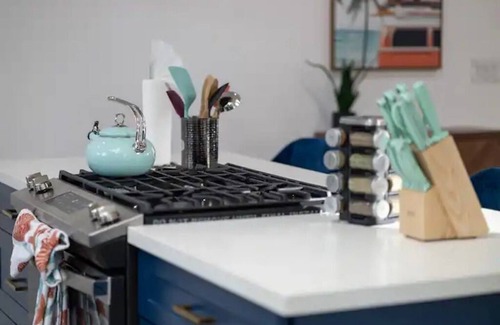 The kitchen is gorgeous - new and sparkling clean, with everything pot, pan, and dish you could need to make a home cooked meal. We also provide cooking spices, olive oil, and a coffee/tea bar (a Keurig, K-Cup pods, tea bags and kettle).