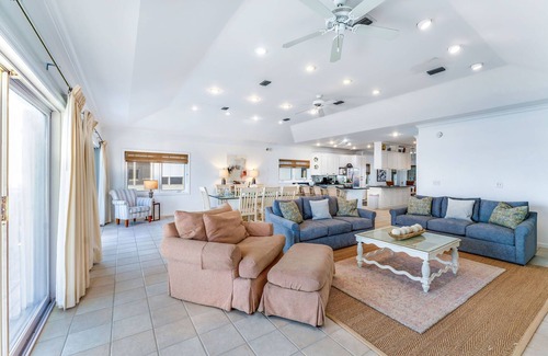 The second floor of this home features a large and open living/dining/kitchen floor plan. Enjoy views of the Gulf and Bay, while preparing coastal meals in the well-appointed kitchen with stainless appliances and granite counters. The dining area with seating for 8 is perfect for meals, games and puzzles.