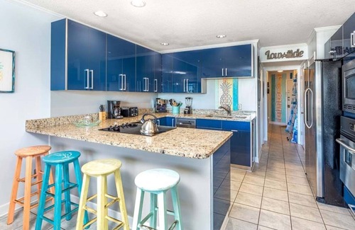 Beach and Racquet A330 is an updated top floor condo at the Beach and Racquet Club located just a few steps from Tybee's North beach. The Moon River beckons you to relax and unwind in this beautifully decorated beach condo. This condo has been renovated and includes a unique, high-end modern kitchen with all custom cabinets, full-size stainless appliances, beautiful granite countertops, and even has a built-in wine cooler in the design. The large breakfast bar offers seating for 4. This kitchen can become your sanctuary - a meeting place to plan the day's events, or to unwind after a day at the beach!