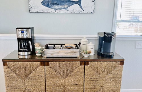 Coffee bar with Keurig Coffee Maker and 14 cup Coffee Maker, assorted coffee and teas.