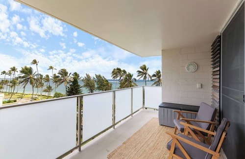 Enjoy oceanfront access right on the beach! The nearby reef protects the area, making it ideal for snorkeling in calm waters, while larger wave beaches are just a short distance away. You`ll find a variety of food options, including shrimp, Thai, burger, and Vietnamese food trucks, as well as a Hawaiian ice stand and convenience store just a half-block away.