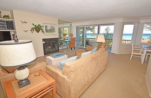 Escape to this mid-level beachfront condo and experience Lake Michigan from another point of view! This two-bedroom, air-conditioned home away from home is nothing but the best option for a memorable retreat with your family and friends. Admire unparalleled sunsets from the lakeside deck, which has been equipped with an outdoor dining table for four for unbeatable meals alfresco. The light and airy living, kitchen, and dining space have been furnished with the best and most comfortable and convenient furniture for your stay. Gather around the fireplace in the living room for a cozy evening at home whether it's sharing today's adventures, planning your next steps, or simply watching TV. Then, when hunger strikes, the fully appointed kitchen will make cooking a breeze. Enjoy your feast at the six-person dining table with wonderful lake views. Additional amenities include ceiling fans, VCR/DVD, washer/dryer, and high-speed WiFi.
