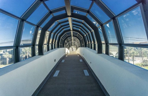 Air conditioned, indoor sky bridge from parking garage to building.