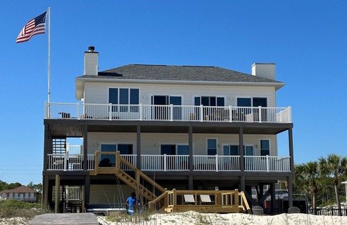 Enjoy breathtaking, unobstructed beachfront views from every deck and patio. Start your day with a morning coffee or unwind with an evening cocktail on the expansive shaded deck off the bedroom level. The equally spacious, sun-drenched top-level deck—accessible from the open living area—features a large table for alfresco dining and multiple cozy seating areas. Above it all, our American flag soars proudly.