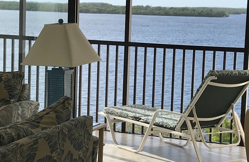 Watch the dolphins and enjoy stunning sunsets over San Carlos Bay from this 4th floor corner (south/west) condo and spacious L-shaped wrap around lania. Enjoy morning sunshine while watching the dolphins splashing and evening sunsets over the water from this extra spacious lania terrace.