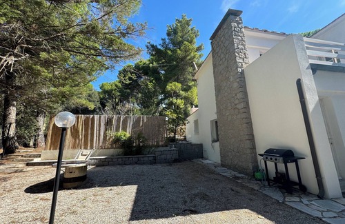 Beachfront villa in the Gulf of Guardiola, at the far end of Procchio beach. Accessible by car only for residents or on foot/by sea. Private garden with direct access to the sea and private parking. On two levels: upstairs, 3 bedrooms (double, single, and triple with 140 cm bed and bunk bed), bathroom with bathtub, and sea-view terrace; downstairs, living room, kitchen, 2 bathrooms, and a single bedroom.