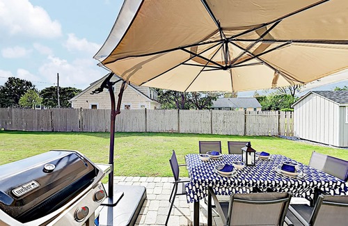 After a sun-soaked day at the beach, rinse off in the privacy of the fenced outdoor shower before heading inside to unwind. Afterward, make your way inside your vacation home. Coastal charm meets modern comfort in the bright and airy living area, where a plush leather sectional and a 50” cable TV set the stage for effortless movie nights. Prepare fresh, local seafood in the newly updated kitchen, featuring sleek quartz countertops and a full suite of stainless steel appliances. The kitchen island offers a casual spot for meals, while the backyard beckons with a barbecue grill and alfresco dining for the whole group.