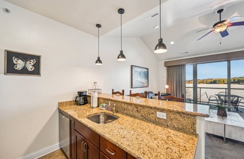 Perfectly situated waterfront and perched above one of the two beaches, this condo is easily accessed up a single flight of stairs (indoors) from the parking lot. The indoor and outdoor pools are just a 2-minute walk. In the summer, you are just steps away from the private beach and you can fish from the docks. Noah's Ark waterpark is an 8 minute (.4 mile) walk so you can avoid paying for parking there and comfortably return to your own condo for lunch mid-day.