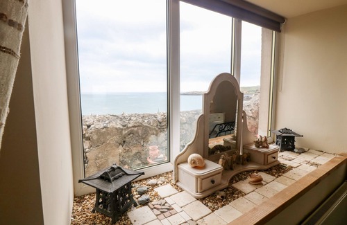 Beacon Cottage offers spectacular coastal views from a delightful position in Cemaes Bay on the Isle of Anglesey. This upside down accommodation plays host to four bedrooms; a 5' four poster ground floor double, a ground floor double and two twins, one on each floor. The cottage also has a first floor sitting room, and there is also a kitchen on the first floor, a utility, a snug reading room and a shower room along with a bathroom on the ground floor. Outside is an extended, rear enclosed garden with seating and off-road parking for two cars. Beacon Cottage is of unique design, a comfortable retreat in an area of beauty. Note: Property accepts adults only. Note: Property is an aged property which is in close proximity to the sea and receives damage from the salt air and sea spray. Please Note: There are no car charging facilities at the property. Please note: This property only accepts 1 child per adult. Please note: This property is for holiday lets only, no residential bookings.