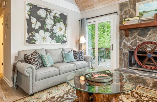 The home sleeps up to 6 comfortably with 2 bedrooms and 2 bathrooms, plus a bonus loft bedroom. The main level bedrooms are furnished with a King size bed in the first, and the second has 2 twin beds. These rooms share a bathroom. The loft area upstairs has a king-size bed and beautiful views from the A frame windows of the lake. The full en-suite bathroom in the loft area has a custom tile walk-in shower. There are 3 cable TVs; the living room TV is smart-enabled for streaming, and secure wireless internet.
