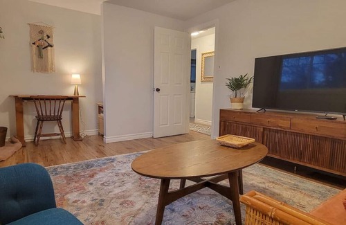 This beautiful newly renovated apartment is complete with a kitchen, 1 bathroom, 1 bedroom, a living room and a dining room. The kitchen is equipped with a full sized fridge, coffee maker, microwave, toaster and other small kitchen appliances. Sheets, pillows and towels are also provided. The house has an extra large driveway where you can park your vehicle and possibly a small watercraft if you are planning to take advantage of the lake! You will need to walk up a set of indoor stairs to access the unit. The unit is also set up with a desk and wifi if you are travelling for business. There are also two smart tv's (one in the bedroom and one in the living room), which you can log into your netflix account to watch shows and movies. The space is ideal for 2 guests, however we do have a pullout couch in the living room for an additional guest or children.