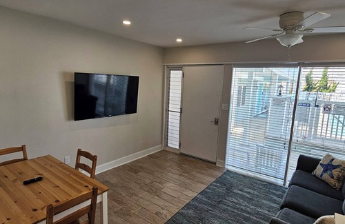 Beautiful 1 bedroom condo that sleeps 6. 2 full beds and 1 pull out sofa. This building is located just steps away from the beach and boardwalk. Condo is located on the 1st floor, so no need to struggle with luggage up the stairs. Just park and walk right to the door. Great location for older or handicap people who have trouble with stairs. Perfect for the family with the pool entrance right outside the door. Off street parking and steps from the beach and boardwalk. What more could you ask for? It is also close to Seaport Pier! The laundry room and outside shower to spray down your beach gear are located close to the room also. This condo has everything you need to have a great vacation!!!