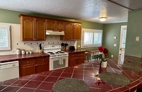 The kitchen features a stove, a microwave, a full sized refrigerator, coffee maker, toaster, dishwasher, a large kitchen bar to dine at, and essentials like salt/pepper, oil, tea, coffee, creamer, sugar, etc. We do include a welcome gift of pastries to get you started on your first morning.