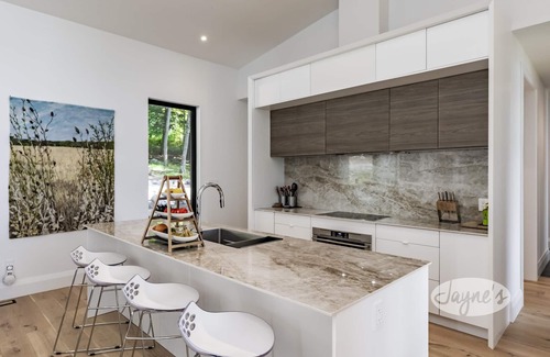 The kitchen featuring stunning Dekton counters, an induction cooktop and a glorious island with seating for 4. The pantry kitchen is on the other side of the wall, featuring the fridge/freezer, microwave/convection oven, second sink and smaller appliances!