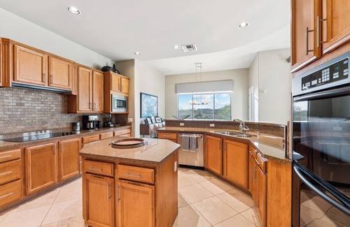 This lovely house in a gated community in North Scottsdale, close to Carefree and Cave Creek, offers 4 bedrooms, including 1 king bed and 3 queen beds, and each bedroom has its own bathroom. The fourth bedroom is a separate casita. In addition, the house has an office and a family room.