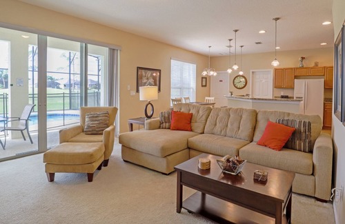 Located on the fourth fairway of the White Heron Golf Course, you will this fantastic vacation home in the much sought-after Ridgewood Lakes community in Davenport, Florida, a gated community. If you are looking for peace and quiet in a gated community away from the dizziness of a day in Orlando's Theme Parks, look no further! Walk through the front door and feel the charm and peace of this delightful home. Vaulted ceilings, living room and family room, Games Room, pool and jacuzzi.