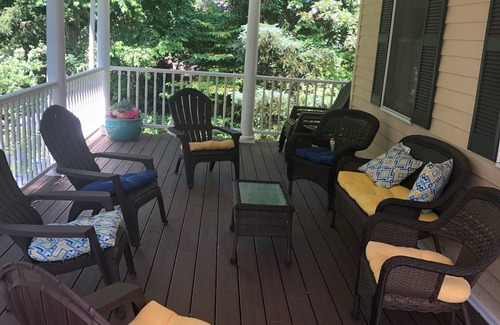 The house is located on a quiet street, has a large front porch, private back yard and 2 large decks for casual dining and relaxing.