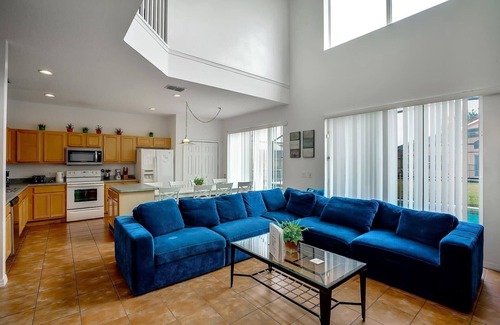 KITCHEN/BREAKFAST AREA The large open plan fully equipped kitchen contains all the modern appliances needed including a large fridge freezer with ice maker. The adjacent breakfast/informal dining area has a large modern high table. FAMILY ROOM The family living area which is open plan adjacent to the informal dining area has a full height ceiling and is overlooked from the upper floor landing balcony and loft area.The stunning decor, furnishings create an ideal area in which to relax and watch cable TV . It takes about 10/15 minutes to get to the main Disney attractions and about 20 minutes to get to Sea World and 25 minutes to Universal Studios. There are numerous restaurants and shopping malls within a short drive and there are over 30 golf courses in the area.