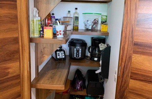 Fully equipped kitchen: Toaster, toaster oven, coffee maker, blender, gourmet pots and pans, baking dishes, serving bowls, microwave, garbage disposal, full-sized stainless steel refrigerator with lots of Ice cube trays.