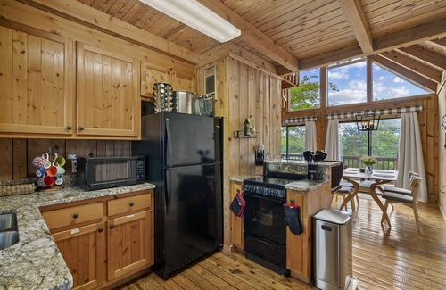 The open-concept layout seamlessly connects the living room, dining area, and kitchen. The living room features cozy seating and a 60 inch smart TV, allowing you to relax and unwind after a day of adventure. Floor to ceiling windows with three sliding glass doors let in abundant natural light, creating a bright and airy atmosphere that adds to the overall charm of the space.